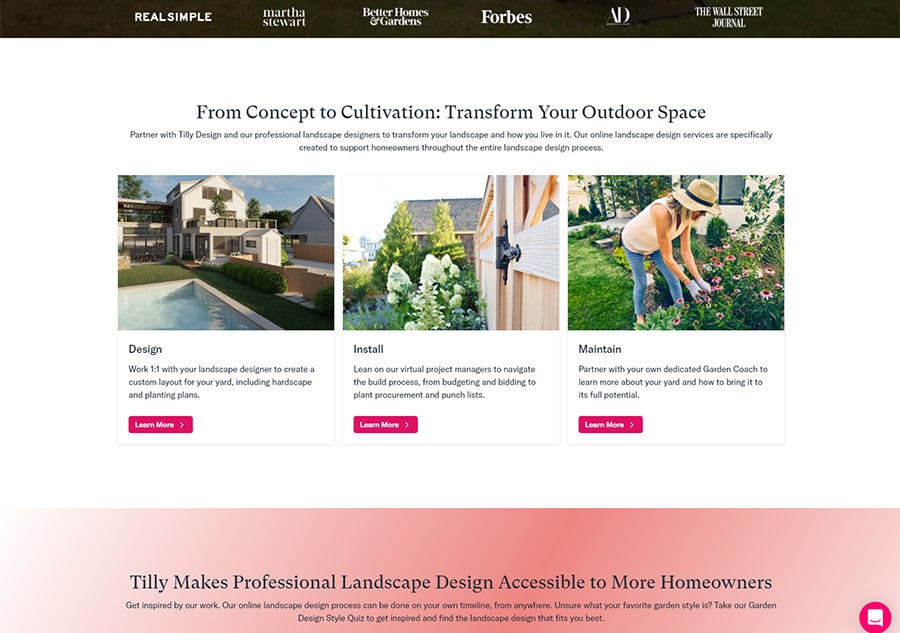While installation isn’t included, their polished website, detailed questionnaire process and their commitment to including native plants and sustainably sourced materials in each project make this company more than worth a second glance.