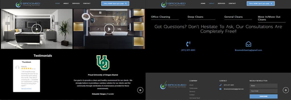 Let’s start off with Broomed Cleaning Services: there’s lots to talk about with this sleek and stylish website. Using a clean image grid over a black background gives a sense of cohesion and abundant content-just what you’re looking for when it comes to before and after images and testimonials.