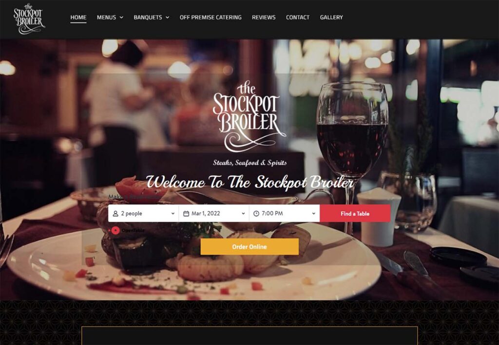 The warm tones and intimate setting of the hero image lends a lot to this site, perfectly matching the steak and fine spirits offered in The Stockpot Broiler’s menu. We love how the white cursive and multiple font sizes balance the open table integration, allowing the users to easily set up in person or takeout dining without disrupting the overall presentation of the home page.